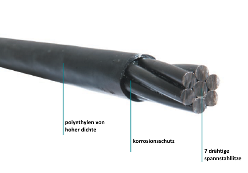 Flate umhüllte Litze mit beschichtet mit der entsprechender Masse und plastifiziert in Linie mit Polyethylen von hoher Dichte. Dieser Schutz erweist sich wirksam gegen Rost, so dass die Litze einfach in die Kunststoffabdeckung gleitet.