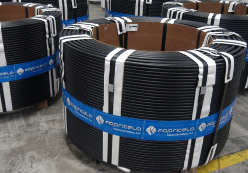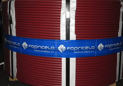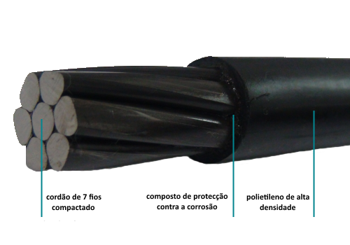 Le toron à 7 fils d'acier lisse est revêtu d'une masse appropriée et plastifiée en ligne avec polyéthylène de haute densité. Cette protection se révèle efficace contre l'oxydation, permettant le glissement du toron à l'intérieur de la couche plastique.